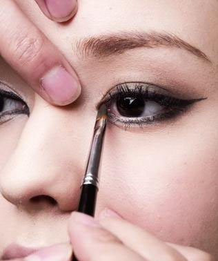 在眼尾处延长眼线,在视觉上拉长眼形。手指抬起眼尾处的眼皮,在眼线末端、近眼角位置把眼线升高,约1cm,并将翘起部分加粗,画成三角形。